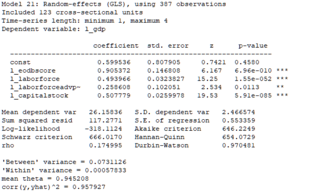 Using a random-effects panel data model that includes 184 countries across 5 years that takes into account the total labour force, gross capital formation, the percentage of the labour force with an advanced education and country-specific effects, I find that for each 1 percent improvement in a country’s Ease of Doing Business Index, GDP grows by 0.9%.